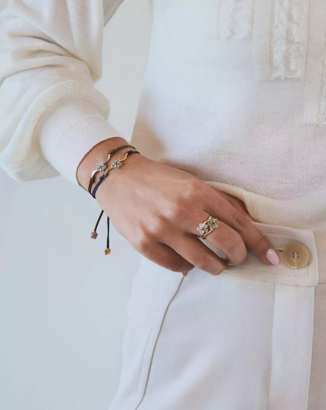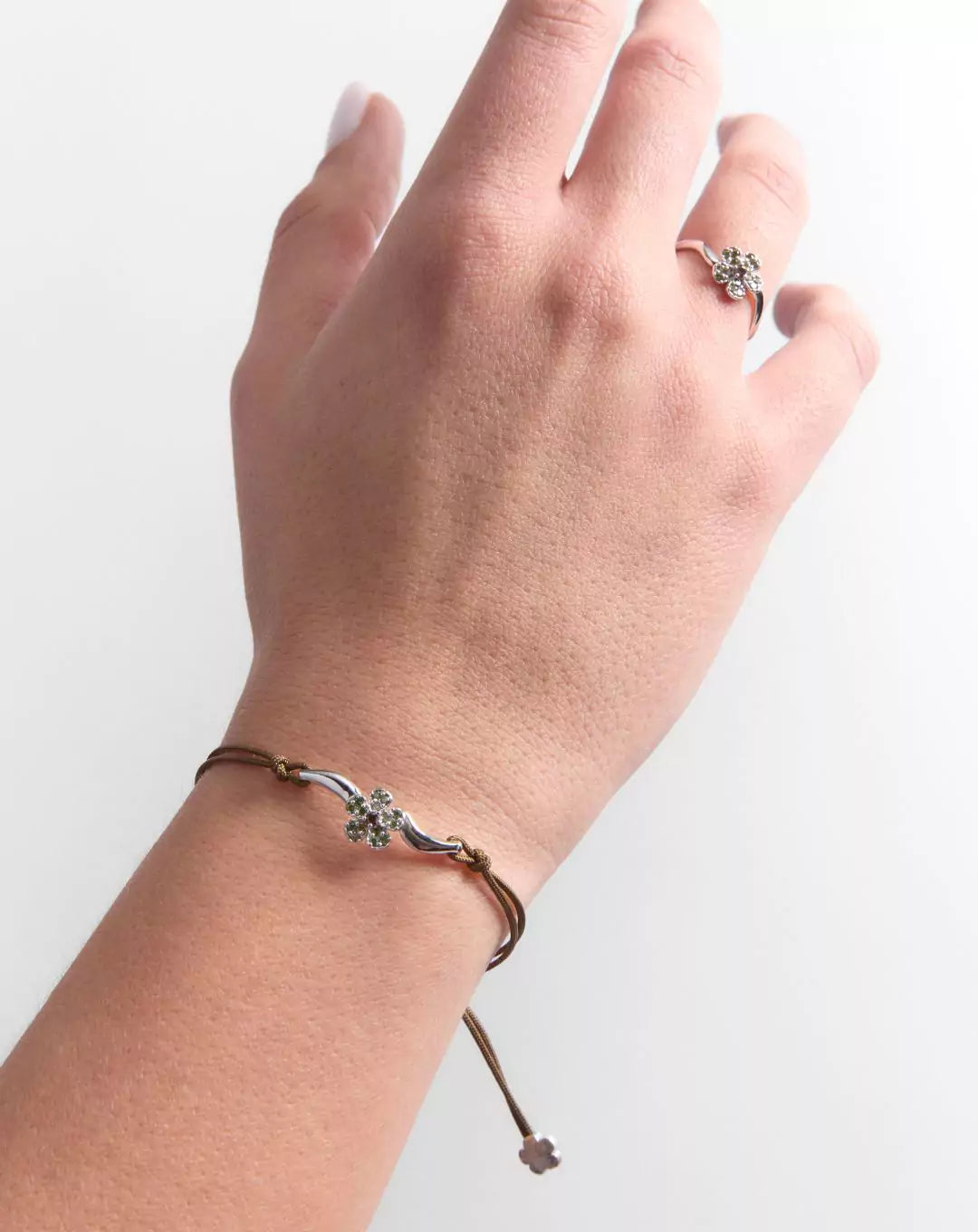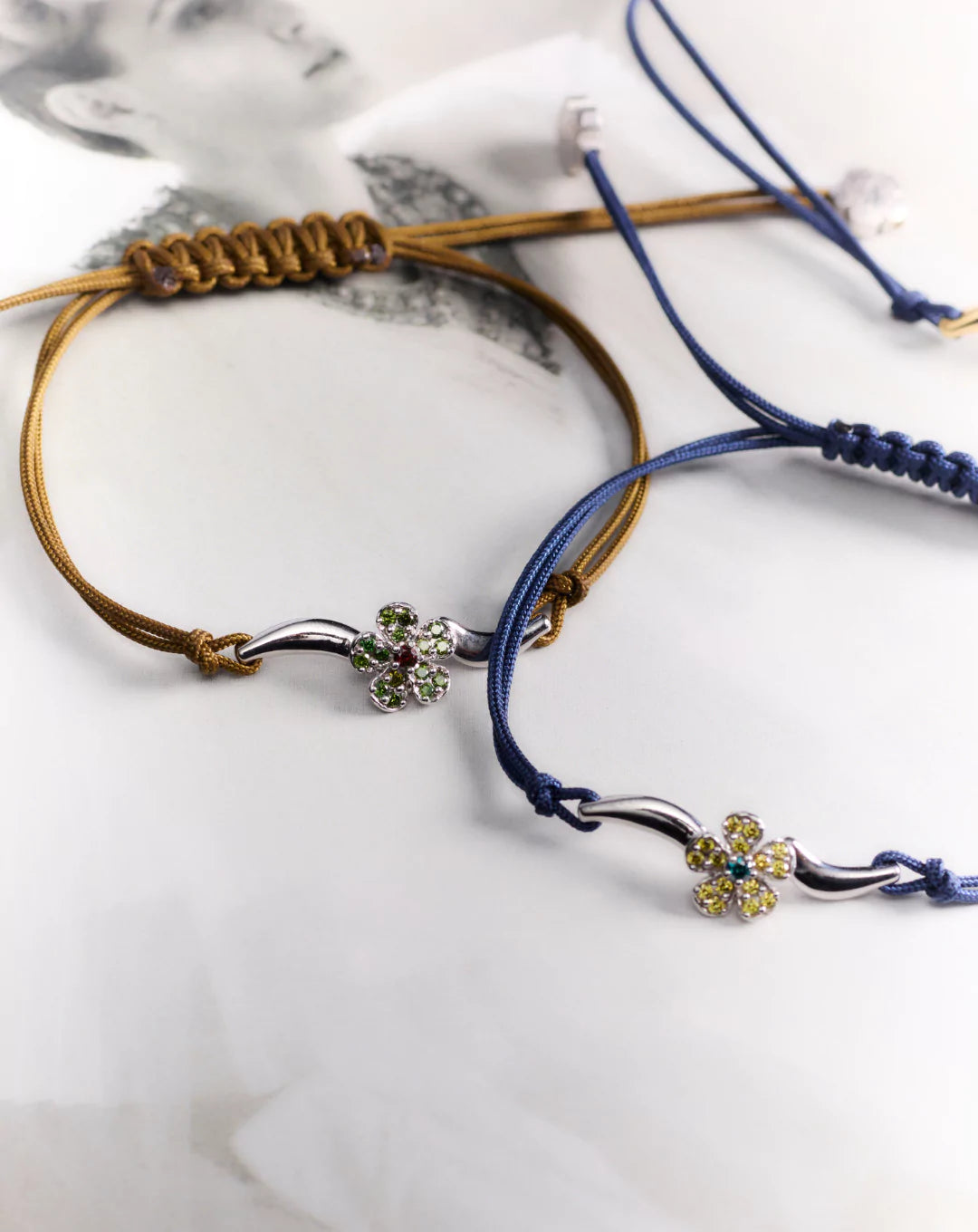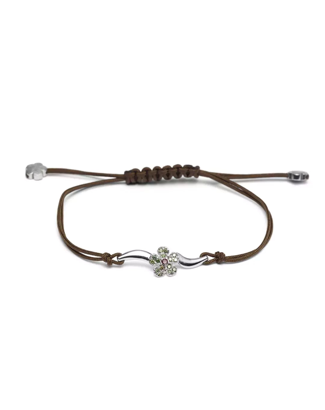 La pieza es acabada con hilo náutico de gran resistencia, en color verde caqui, con cierre de macramé para un fácil ajuste y terminales de oro blanco en forma de flor.