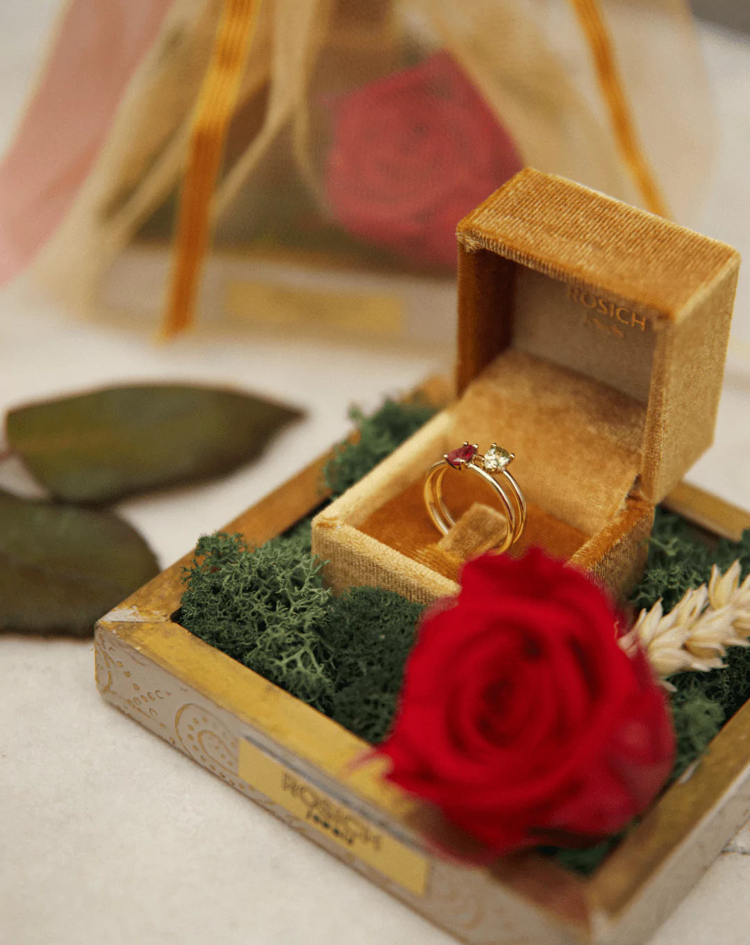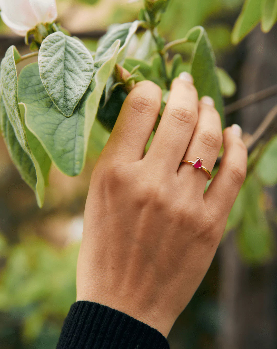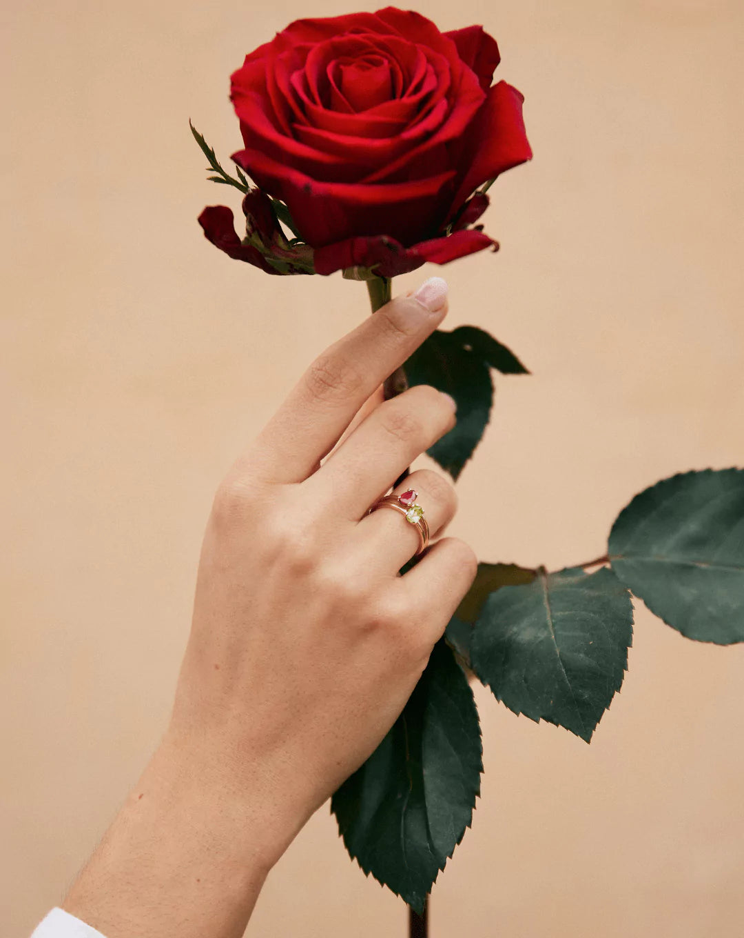 Anillo combinable con el anillo Sant Jordi con peridoto. El conjunto de colores recuerda a el rojo y verde de una rosa y sus hojas. Gema roja de rubí natural de talla pera tiene un peso de entre 0,40 ct y 0,45 ct.